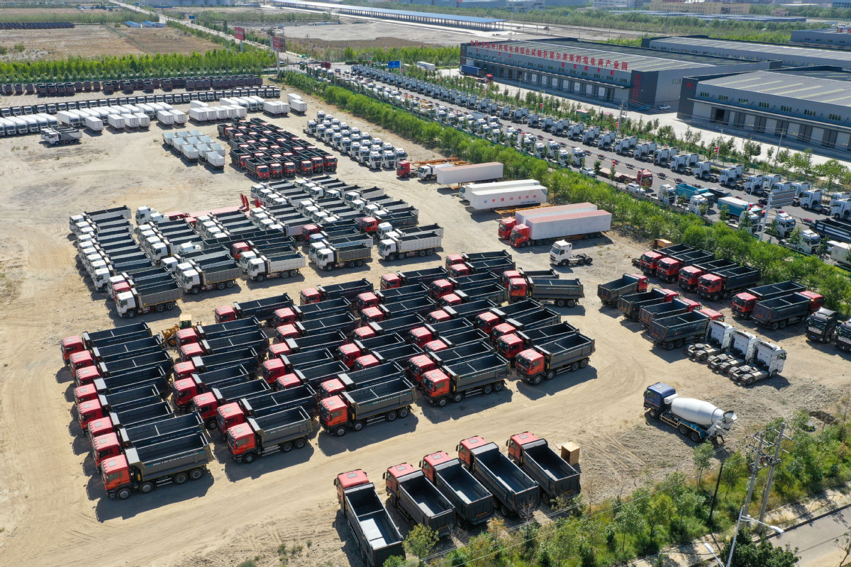 Trailers and dump trucks are ready to be exported at Khorgos Land Port of the Xinjiang Uygur autonomous region of China on July 26, 2023. (Photo/Xinhua)