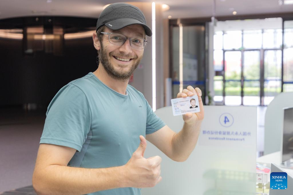 A foreigner shows his Foreign Permanent Resident ID Card at the department of exit-entry administration of Chongqing Municipal Public Security Bureau in southwest China's Chongqing, July 9, 2024. (Xinhua/Huang Wei)