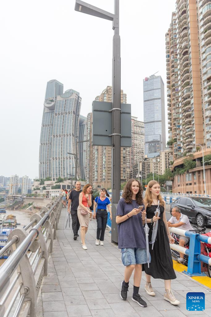 Tourists from Italy head for Hongyadong scenic area in Yuzhong district, in southwest China's Chongqing, July 8, 2024. (Xinhua/Huang Wei)