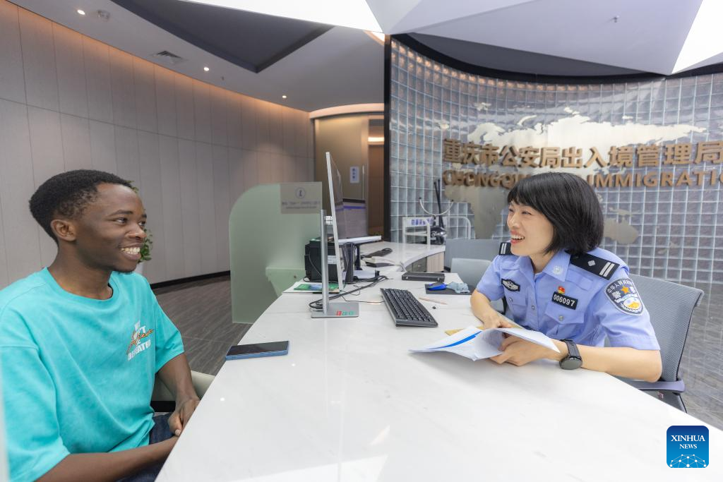 A police officer introduces visa-free policy to a foreigner at the department of exit-entry administration of Chongqing Municipal Public Security Bureau in southwest China's Chongqing, July 9, 2024. (Xinhua/Huang Wei)