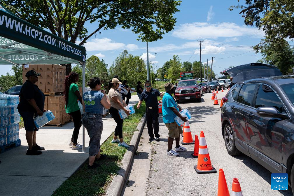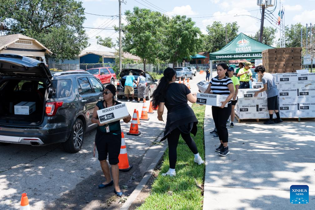 People receive free bottled water at a food distribution site after Hurricane Beryl in Houston, Texas, the United States, on July 9, 2024. (Photo by Chen Chen/Xinhua)