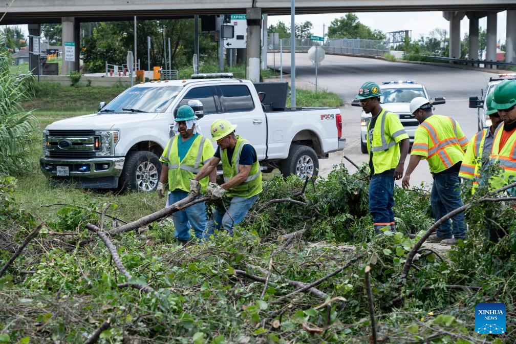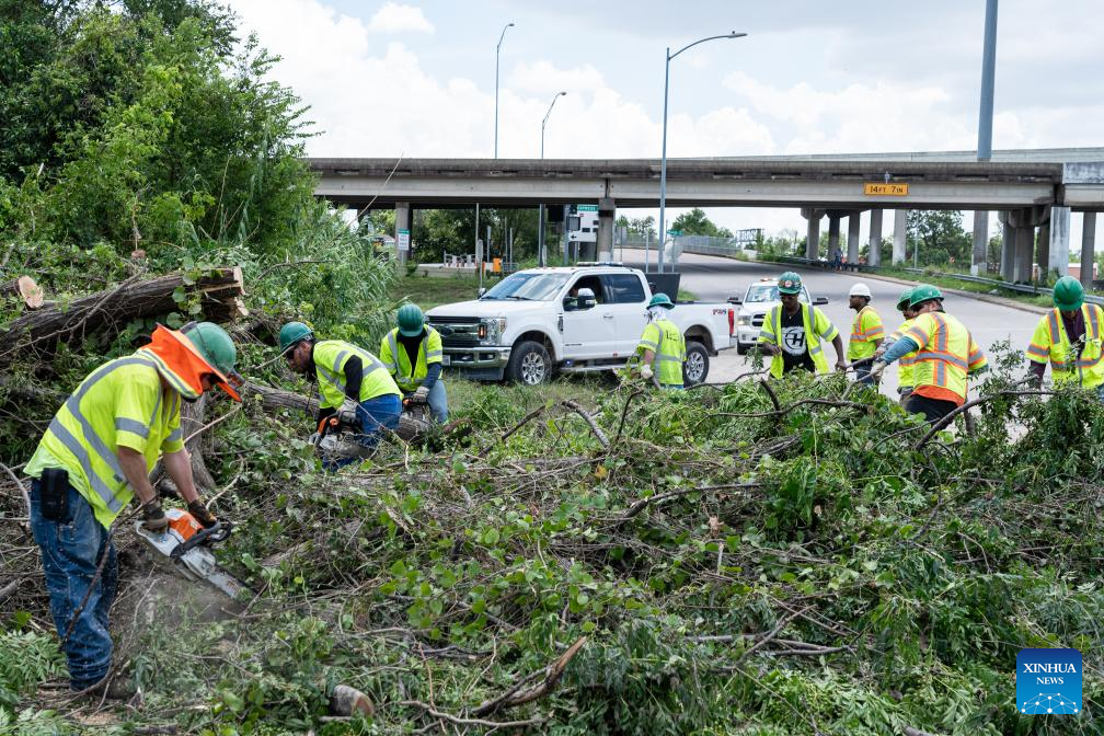 Workers clear debris on a highway after Hurricane Beryl in Houston, Texas, the United States, on July 9, 2024. (Photo by Chen Chen/Xinhua)