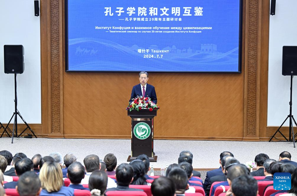 Zhao Leji, chairman of China's National People's Congress Standing Committee, attends and delivers a speech at the opening ceremony of the symposium on the 20th anniversary of the establishment of Confucius Institute at Tashkent State University of Oriental Studies in Tashkent, Uzbekistan, July 7, 2024. Zhao paid an official goodwill visit to Uzbekistan from July 6 to July 9 at the invitation of Tanzila Narbayeva, chairperson of the Senate of Uzbekistan, and Nurdinjon Ismoilov, speaker of the Legislative Chamber of the Oliy Majlis of Uzbekistan. (Xinhua/Zhang Ling)