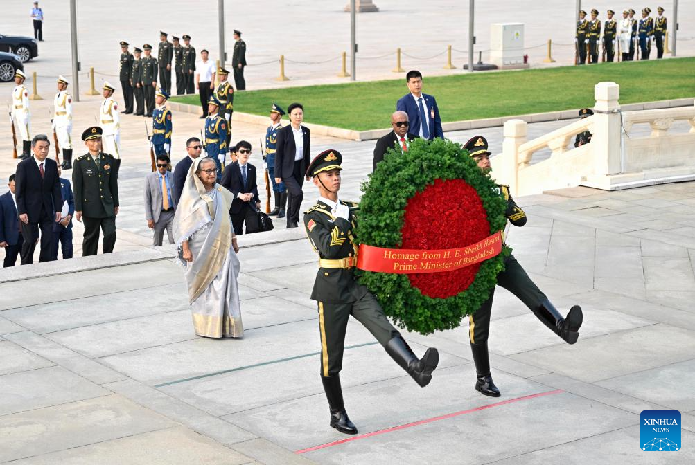 Bangladeshi PM lays wreath at Monument to People's Heroes in Beijing
