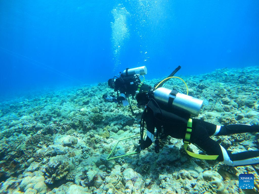 This photo carried in a report titled "The Investigation and Assessment Report on Marine Ecology and Environment Status of Huangyan Dao" shows researchers conducting on-site investigation in Huangyan Dao in 2024.?(Xinhua)