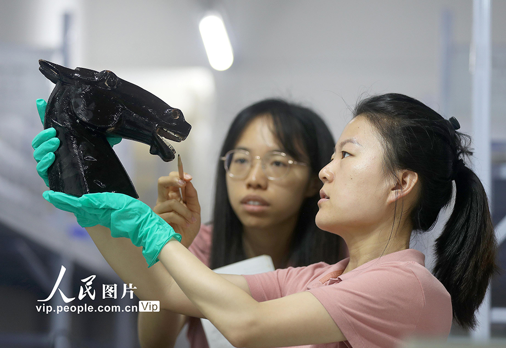 Conservators restore an unearthed cultural relic at Jingmen Museum, central China's Hubei Province, July 4, 2024. (vip.people.com.cn/Zhao Ping)
