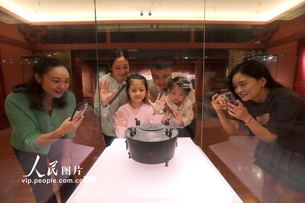 Spectators view a cultural relic displayed at Jingmen Museum, central China's Hubei Province, July 4, 2024. (vip.people.com.cn/Zhao Ping)