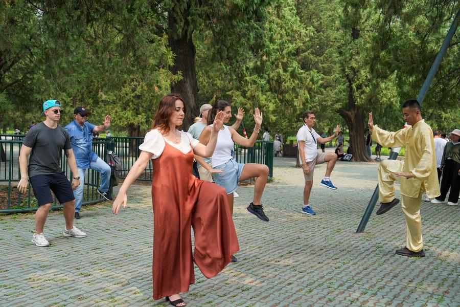 Tourists from Italy practice Tai Chi at the Tiantan (Temple of Heaven) Park in Beijing, capital of China, July 9, 2024. (Xinhua/Ju Huanzong)