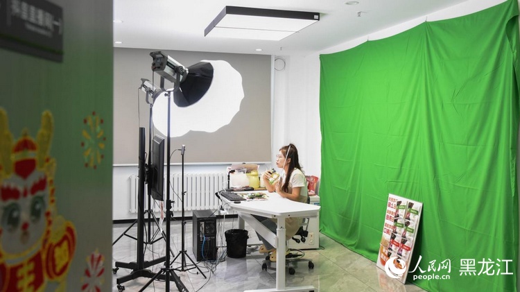 A livestreamer advertises products at the barbecue livestream hub of Qihan Yangjia, a company in Qiqihar city, northeast China's Heilongjiang Province. (People's Daily Online/Xu Chenglong)