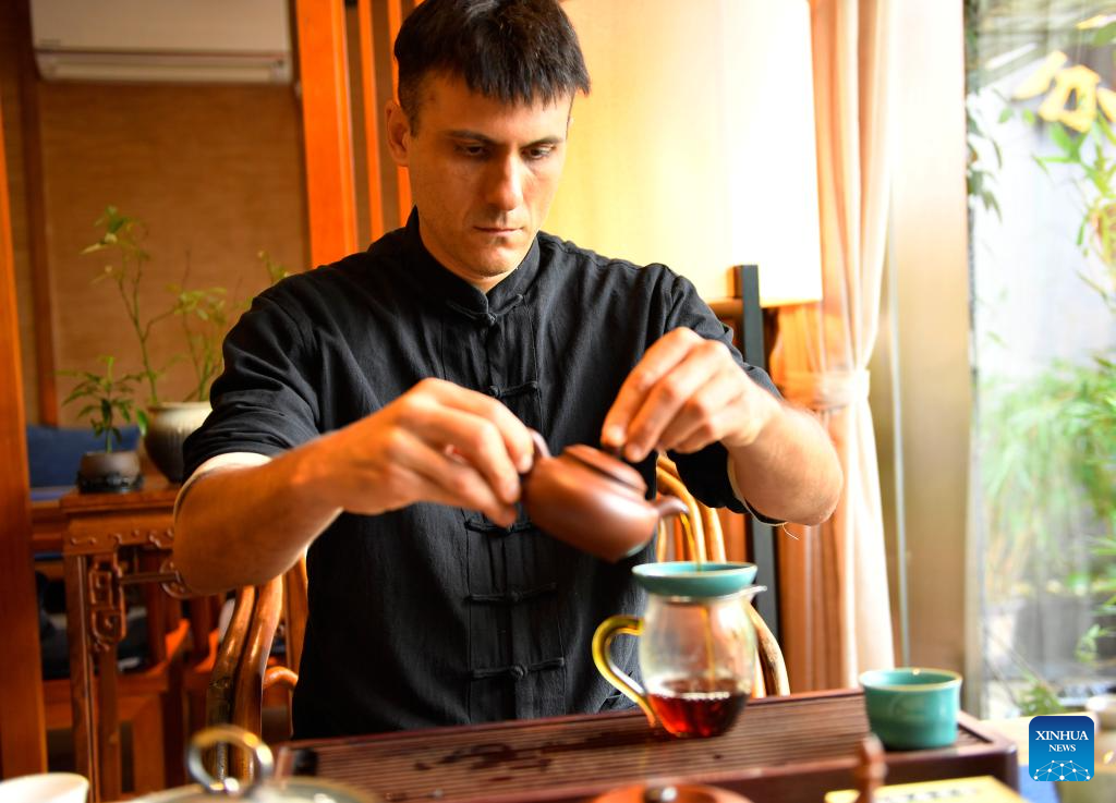 Gabriel de Moraes Neto makes tea in Nanning, south China's Guangxi Zhuang Autonomous Region, July 9, 2024. (Xinhua/Jin Haoyuan)
