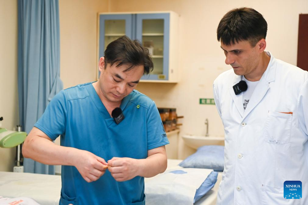 Doctor Liao Lianlian demonstrates as Gabriel de Moraes Neto (R) learns acupuncture at Guangxi International Zhuang Medicine Hospital in Nanning, south China's Guangxi Zhuang Autonomous Region, July 4, 2024. (Xinhua/Cao Yiming)