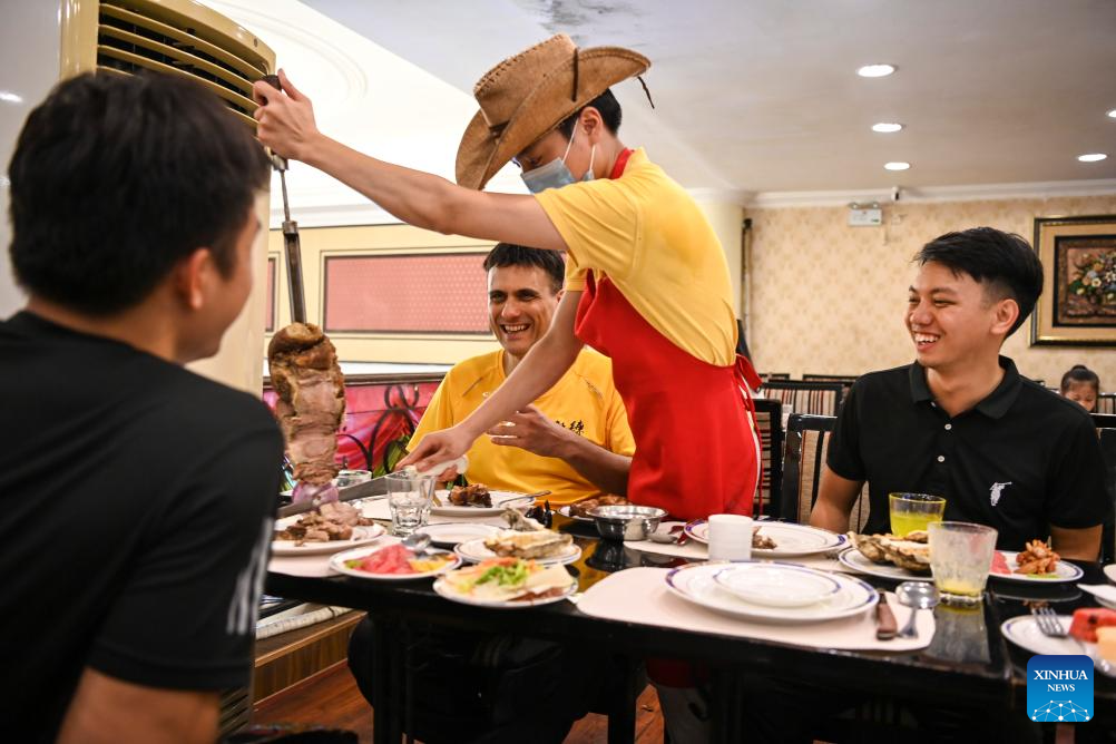 Gabriel de Moraes Neto (2nd L) has meal featuring Brazilian roast meat with his friends in Nanning, south China's Guangxi Zhuang Autonomous Region, July 6, 2024. (Xinhua/Cao Yiming)