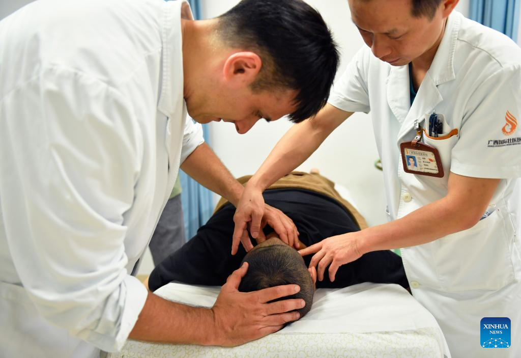Gabriel de Moraes Neto (L) learns massage skills from doctor Wen Yong at Guangxi International Zhuang Medicine Hospital in Nanning, south China's Guangxi Zhuang Autonomous Region, July 4, 2024. (Xinhua/Jin Haoyuan)