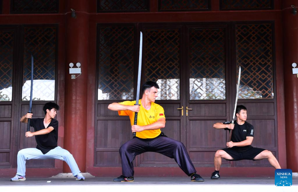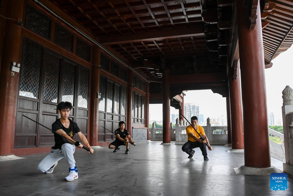 Gabriel de Moraes Neto (C) practices skill of Miaodao, a two-handed long sabre, with his fellows at a park in Nanning, south China's Guangxi Zhuang Autonomous Region, July 6, 2024. (Xinhua/Jin Haoyuan)