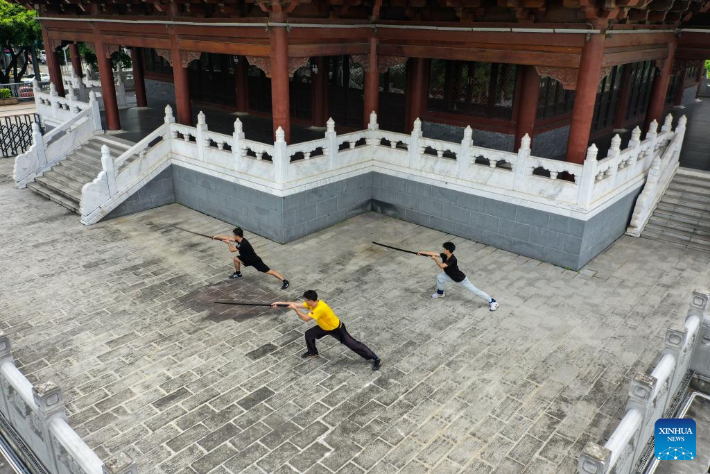 This aerial photo taken on July 6, 2024 shows Gabriel de Moraes Neto (front) practicing with Miaodao, a two-handed long sabre,, with his fellows at a park in Nanning, south China's Guangxi Zhuang Autonomous Region. (Xinhua/Cao Yiming)