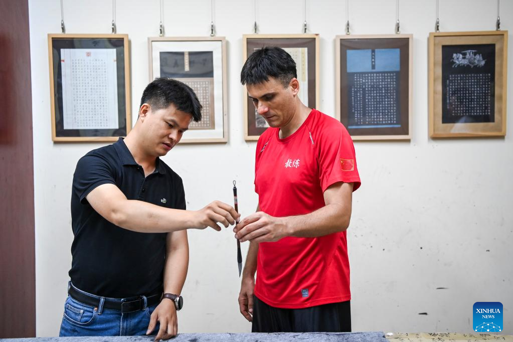 Gabriel de Moraes Neto (R) learns calligraphy from a teacher in Nanning, south China's Guangxi Zhuang Autonomous Region, July 6, 2024. (Xinhua/Cao Yiming)