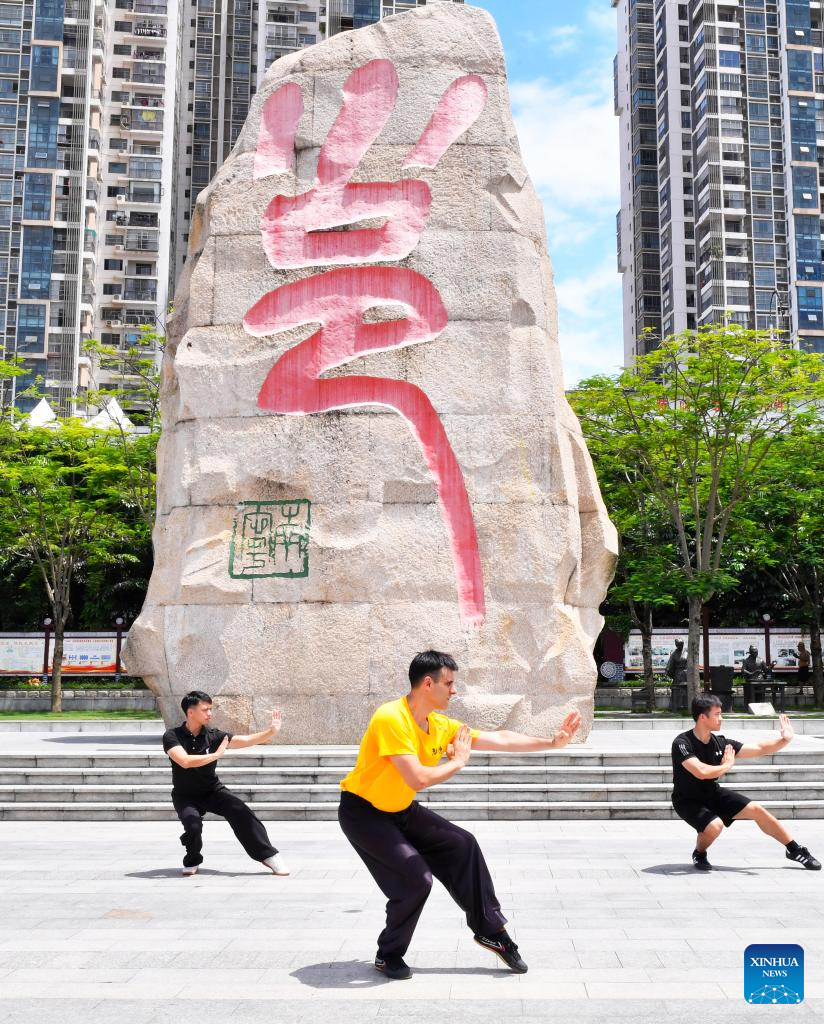 Gabriel de Moraes Neto (front) practices martial arts with his fellows besides Yongjiang River in Nanning, south China's Guangxi Zhuang Autonomous Region, July 6, 2024. (Xinhua/Jin Haoyuan)
