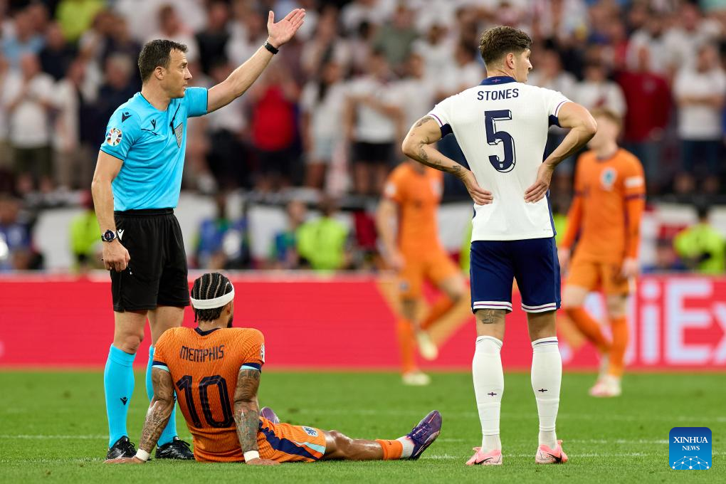 Memphis Depay (bottom) of the Netherlands reacts after sustaining an injury during the UEFA Euro 2024 semifinal match between England and the Netherlands in Dortmund, Germany on July 10, 2024. (Xinhua/Meng Dingbo)