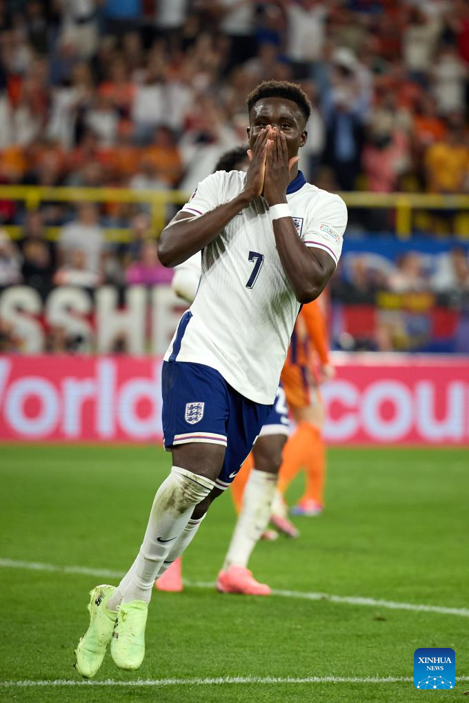Bukayo Saka of England reacts after scoring a disallowed goal during the UEFA Euro 2024 semifinal match between England and the Netherlands in Dortmund, Germany on July 10, 2024. (Xinhua/Meng Dingbo)