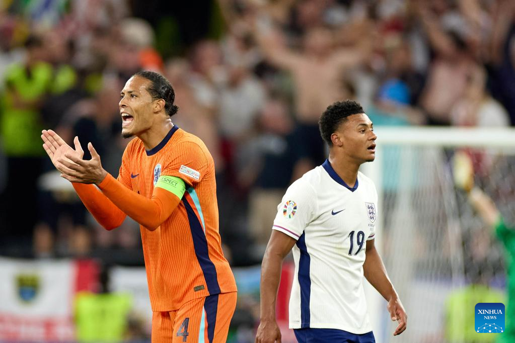 Ollie Watkins (R) of England and Virgil van Dijk of the Netherlands react during the UEFA Euro 2024 semifinal match between England and the Netherlands in Dortmund, Germany on July 10, 2024. (Xinhua/Meng Dingbo)