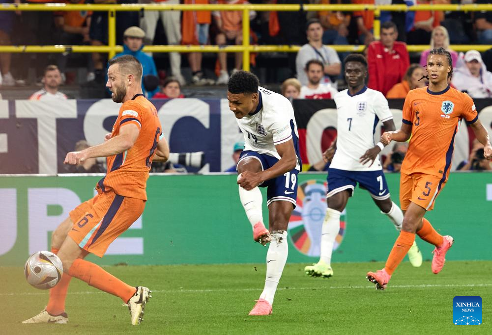 Ollie Watkins (2nd L) of England shoots to score during the UEFA Euro 2024 semifinal match between England and the Netherlands in Dortmund, Germany on July 10, 2024. (Xinhua/Meng Dingbo)