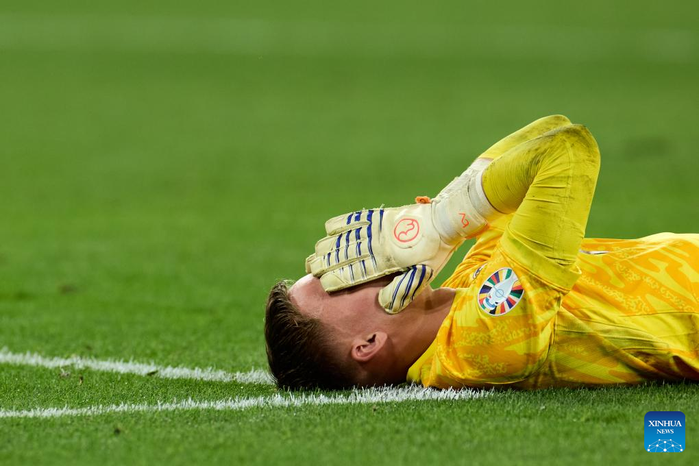 Bart Verbruggen, goalkeeper of the Netherlands, reacts after the UEFA Euro 2024 semifinal match between England and the Netherlands in Dortmund, Germany on July 10, 2024. (Xinhua/Meng Dingbo)