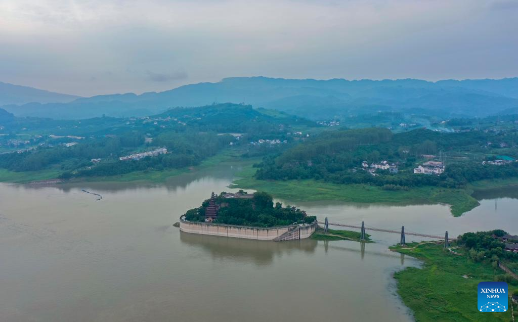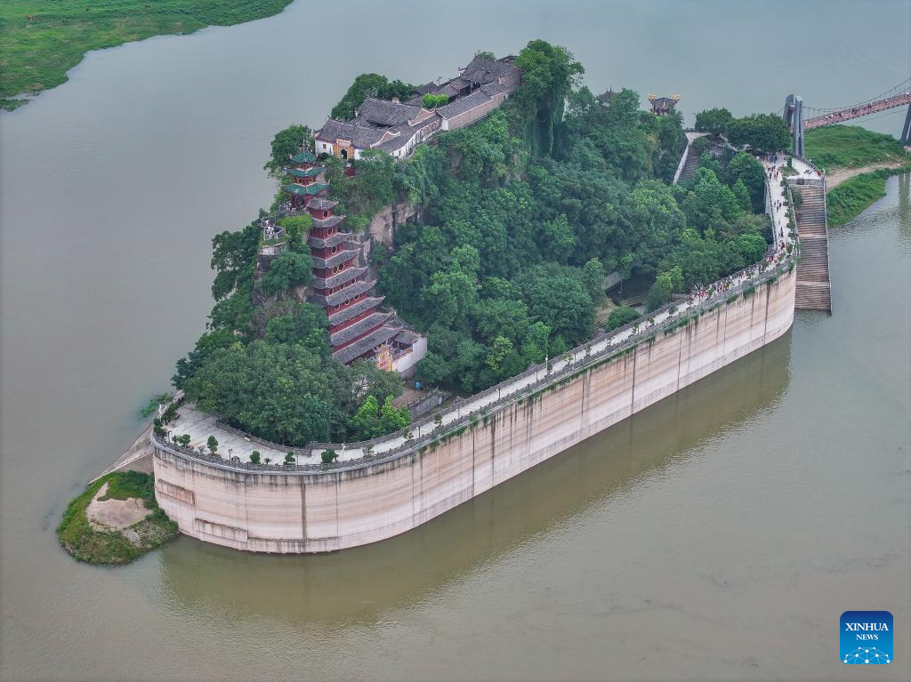 A drone photo taken on July 10, 2024 shows the wooden pagoda in Shibaozhai, a scenic spot in Zhongxian County, southwest China's Chongqing. Shibaozhai looks like a heart-shaped bonsai sitting in the middle of Three Gorges section of Yangtze Rier. It is home to a 12-story, 56-meter wooden pagoda that stands on 20 pillars and leans against the cliff. This structure dated back to the Ming Dynasty (1368-1644) serves as a leading tourist attraction of Shibaozhai. (Xinhua/Liu Chan)