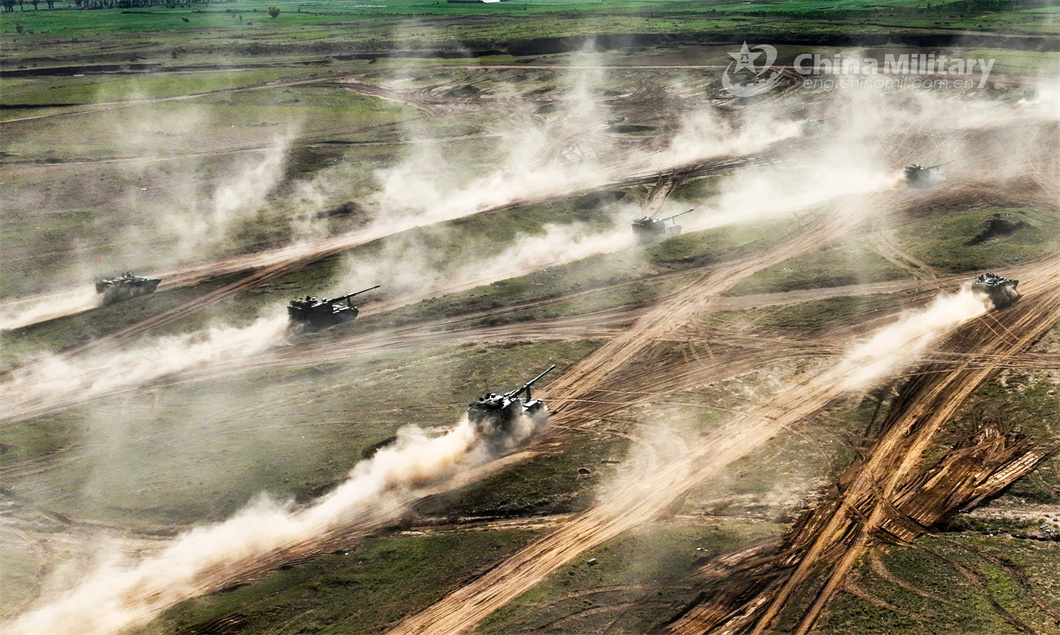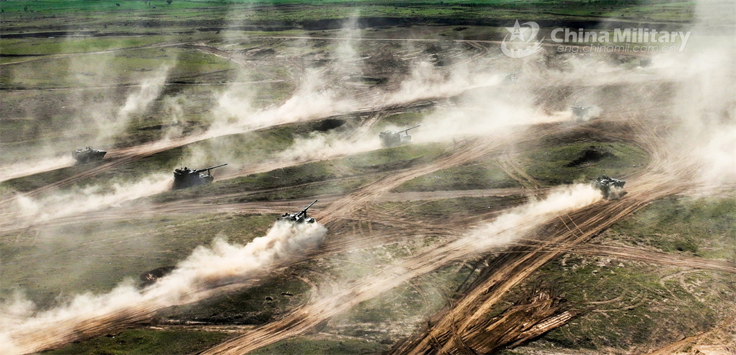 Armored vehicles attached to an artillery element of a brigade under the PLA 81st Group Army move to a new position during a maneuver training exercise on June 26, 2024. (eng.chinamil.com.cn/Photo by Wu Chao)