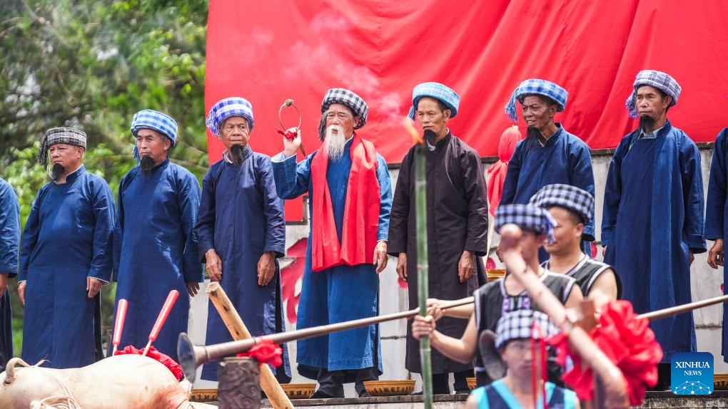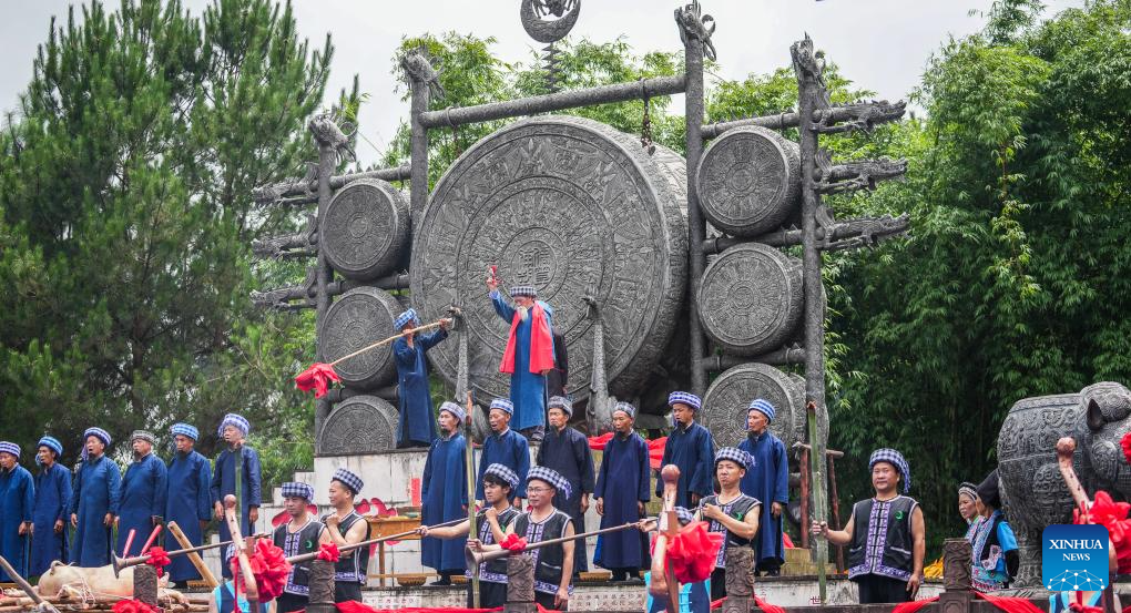 People take part in a traditional folk activity in celebration of "Liuyueliu", an ethnic festival, in Liupanshui, southwest China's Guizhou Province, July 11, 2024. A series of cultural activities have been held during the celebration. (Xinhua/Tao Liang)