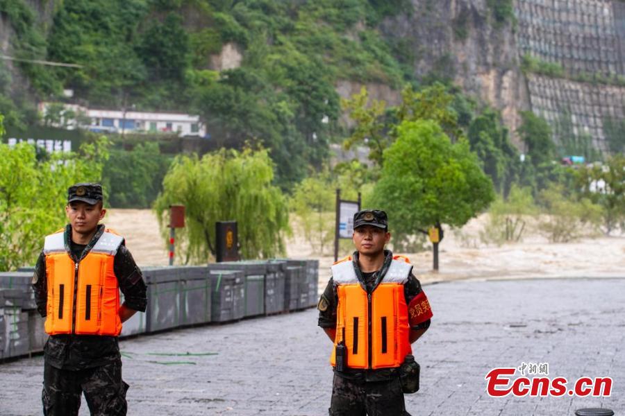 Rescuers stand guard on the bank of Daning River in Wuxi County of Chongqing, July 11, 2024. (Photo: China News Service/Guo Chuanwu)