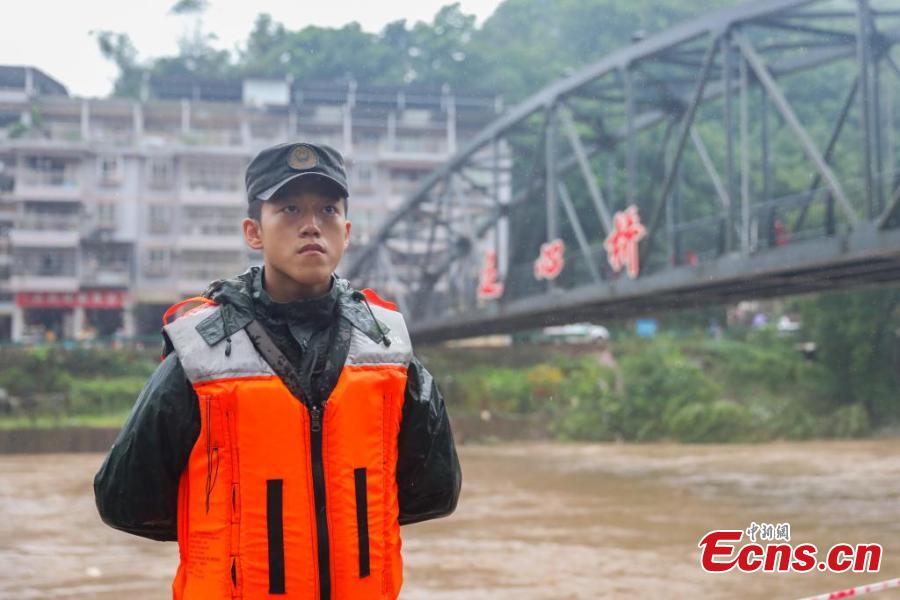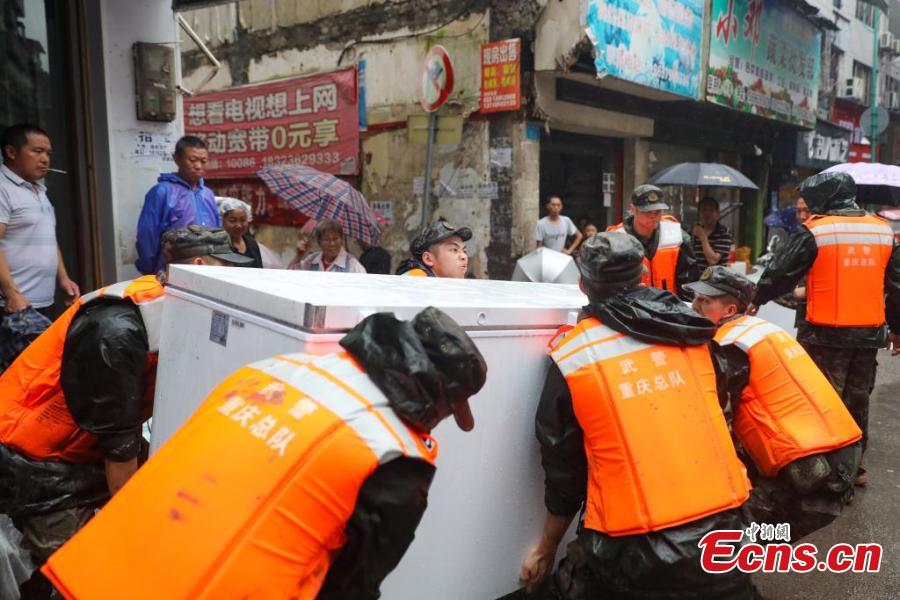 Downpours have hit Chongqing, raising waters above alert levels in 15 rivers. More than 130 local officers and soldiers were sent to help rescue trapped people in the affected areas.