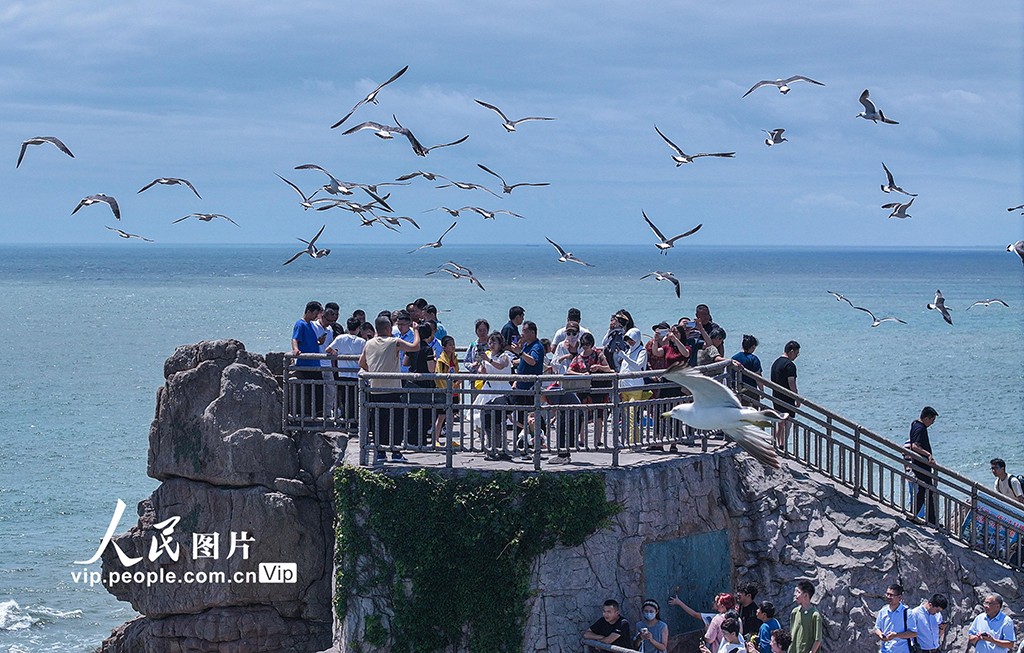 Tourists enjoy interacting with black-tailed gulls in Rongcheng, east China's Shandong Province, July 6, 2024. (vip.people.com.cn/Li Xinjun)