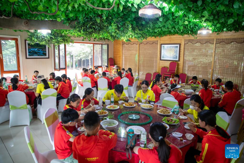 Students who participate in a study and research group eat in a restaurant in Yichun, northeast China's Heilongjiang Province, July 11, 2024. Yichun in northeast China's Heilongjiang Province becomes a popular travel destination in summer. With the city's abundant forest resources, many tourists come here for its fresh air and mild temperature. (Xinhua/Zhang Tao)
