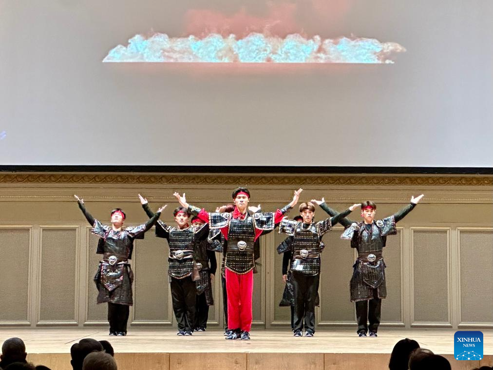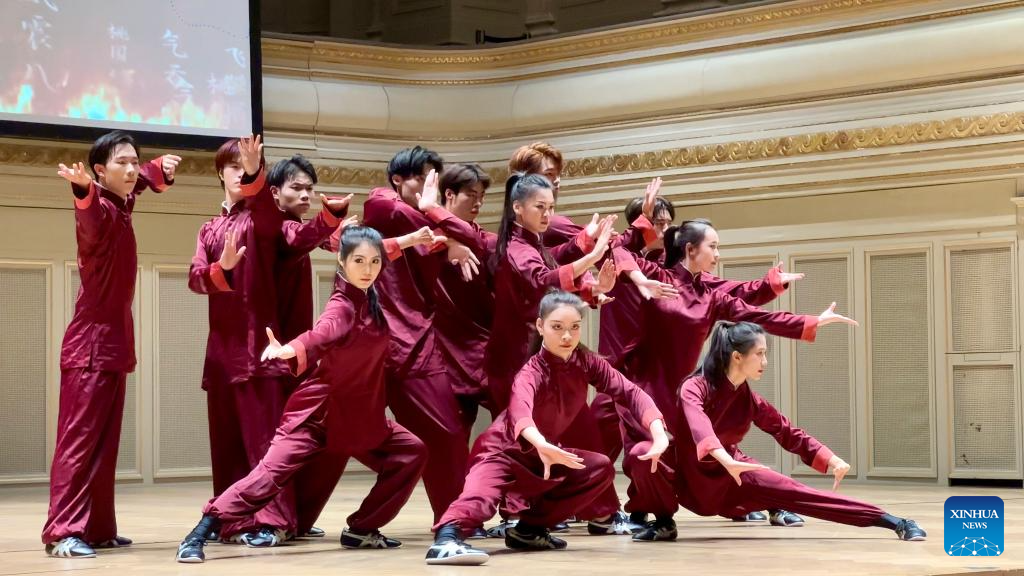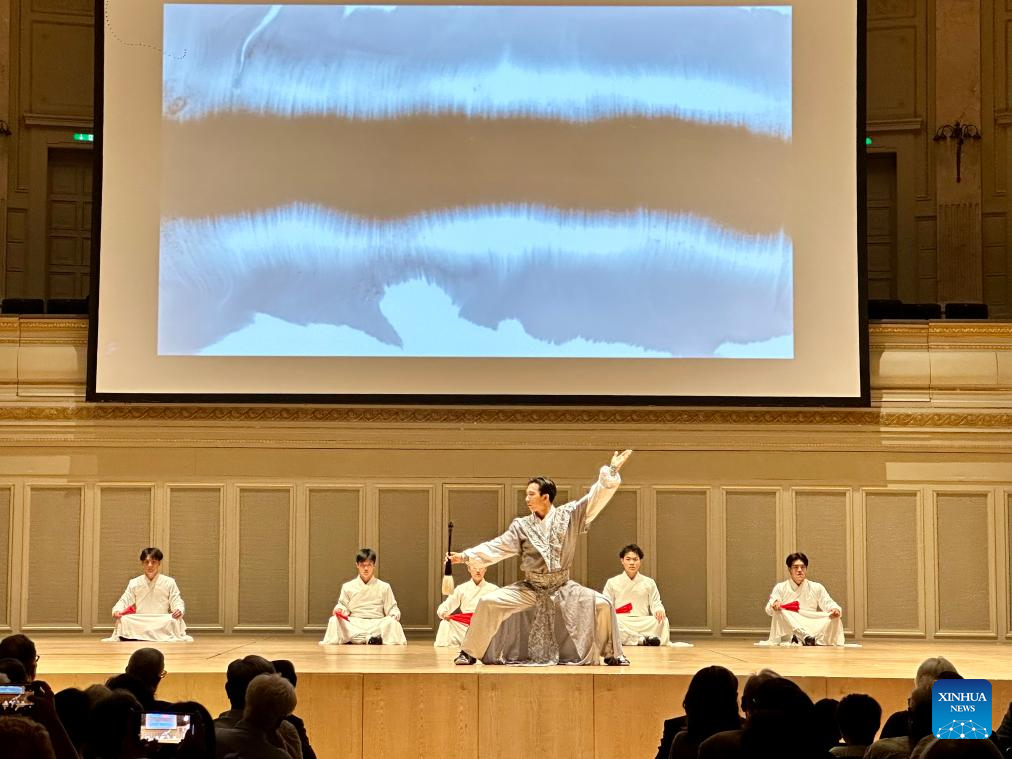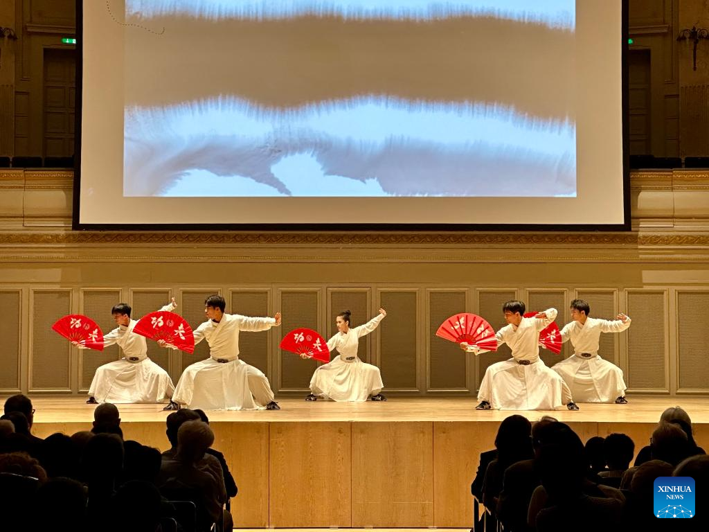 Artists stage a Chinese martial arts performance at "Charm of Chinese Kung Fu 2024 CUPES Wushu World Tour" in Bern, Switzerland, July 10, 2024. The performance was delivered by China's Capital University of Physical Education and Sports. This event aims to facilitate the exchange and cooperation between China and Switzerland. (Chinese Embassy in Switzerland/Handout via Xinhua)