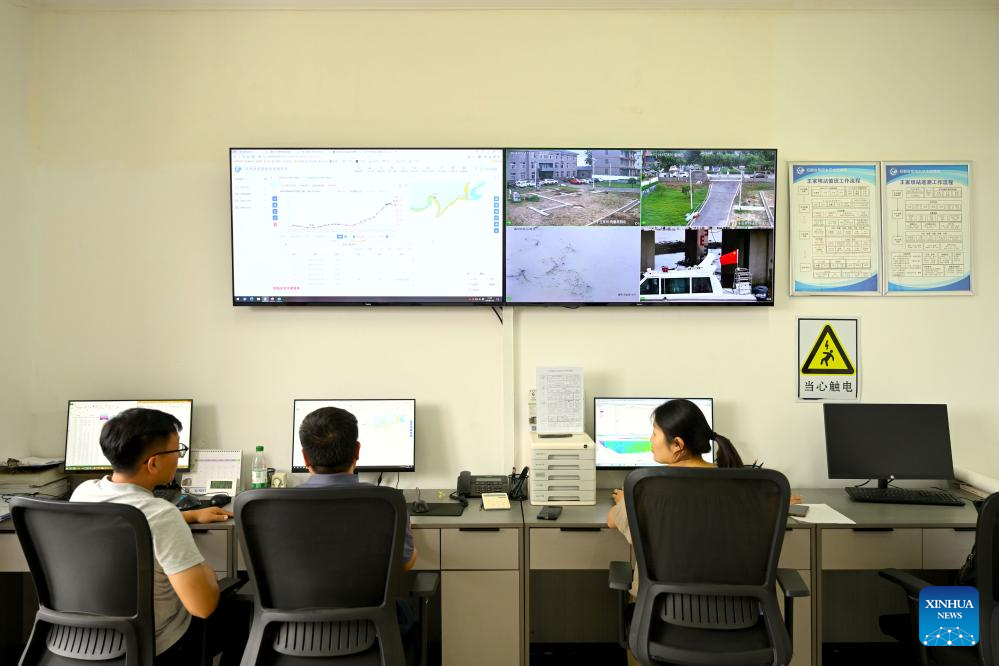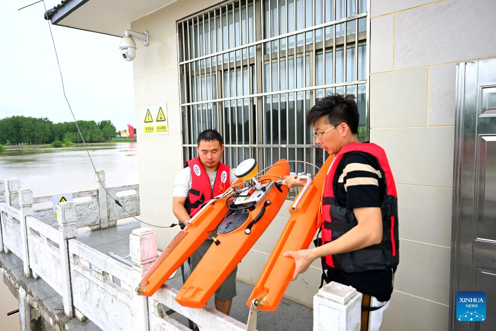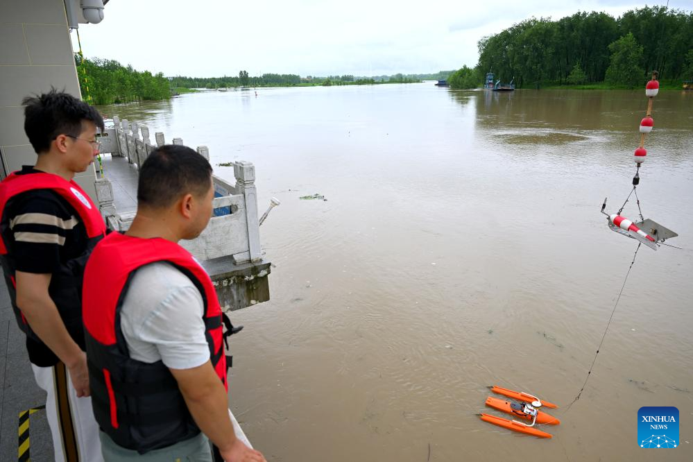 Staff members monitor the flood water at a hydrological station in Funan County of Fuyang, east China's Anhui Province, July 14, 2024. Measures including monitoring the flood water, inspecting embankment and ensuring flood-control materials have been taken by the authorities of Funan County of Fuyang, east China's Anhui Province, to control the "No. 1 Flood" for Huaihe River. (Xinhua/Huang Bohan)