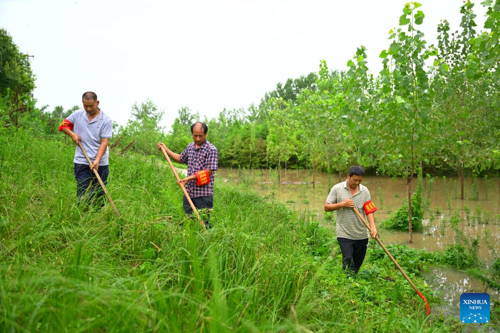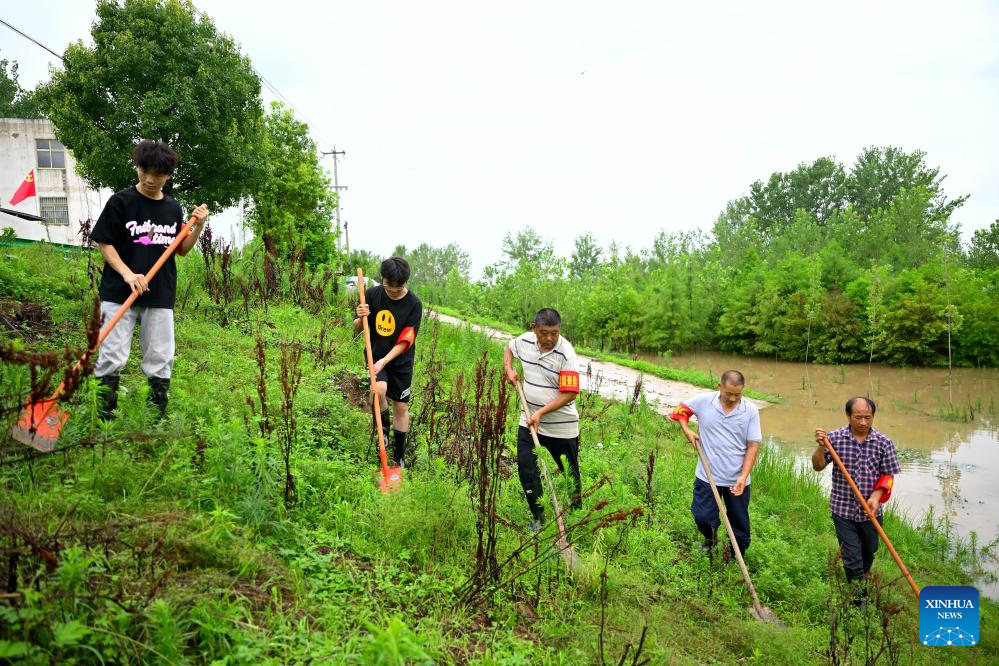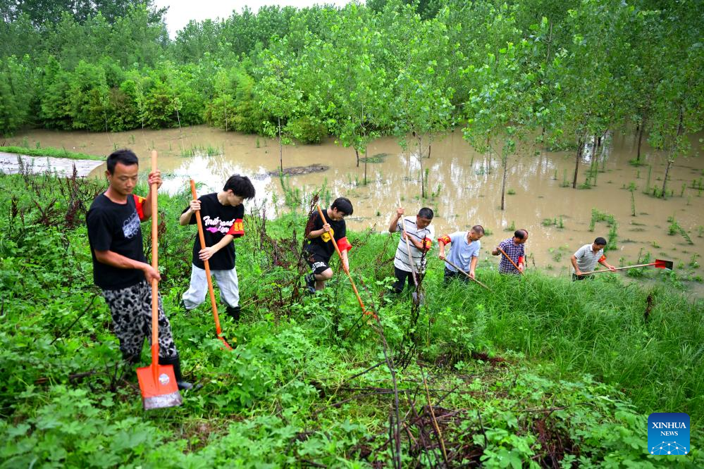 Villagers of Wangjiaba inspect an embankment in Funan County of Fuyang, east China's Anhui Province, July 14, 2024. Measures including monitoring the flood water, inspecting embankment and ensuring flood-control materials have been taken by the authorities of Funan County of Fuyang, east China's Anhui Province, to control the "No. 1 Flood" for Huaihe River. (Xinhua/Huang Bohan)