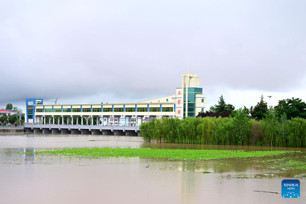 This photo taken on July 14, 2024 shows a floodgate in Funan County of Fuyang, east China's Anhui Province. Measures including monitoring the flood water, inspecting embankment and ensuring flood-control materials have been taken by the authorities of Funan County of Fuyang, east China's Anhui Province, to control the "No. 1 Flood" for Huaihe River. (Xinhua/Huang Bohan)