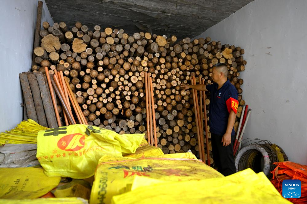 A staff member checks the flood-control materials at Wangjiaba Town, Funan County of Fuyang, east China's Anhui Province, July 14, 2024. Measures including monitoring the flood water, inspecting embankment and ensuring flood-control materials have been taken by the authorities of Funan County of Fuyang, east China's Anhui Province, to control the "No. 1 Flood" for Huaihe River. (Xinhua/Huang Bohan)