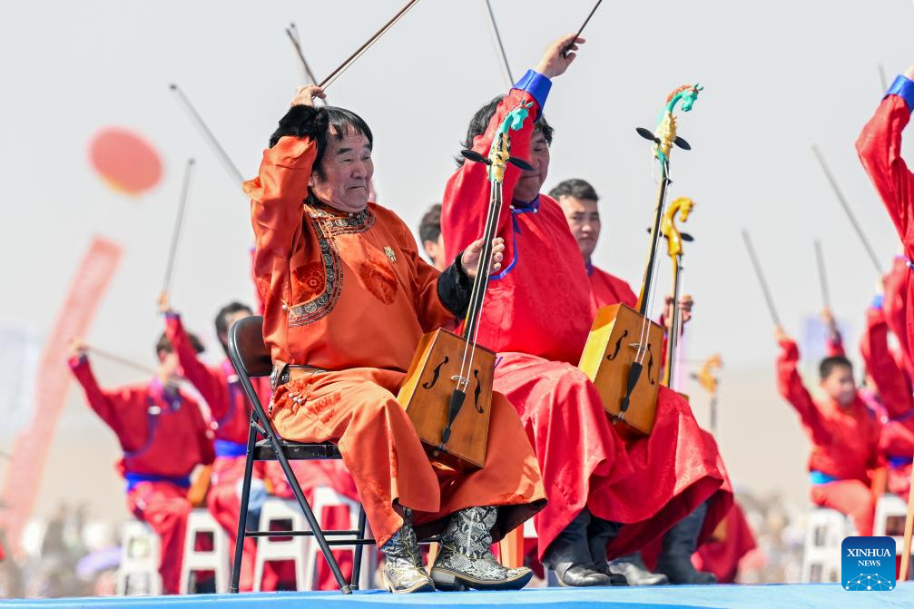 Artists perform during the opening ceremony of the 34th Naadam festival in Xilin Gol League, north China's Inner Mongolia Autonomous Region, July 14, 2024. The Naadam festival kicked off here on Sunday. Naadam, usually held in mid-summer and sometimes in winter in pastoral areas of Inner Mongolia, means "games" in the Mongolian language. It often comprises wrestling, archery, and horse racing, also known as the "Three Games of Men." (Xinhua/Bei He)