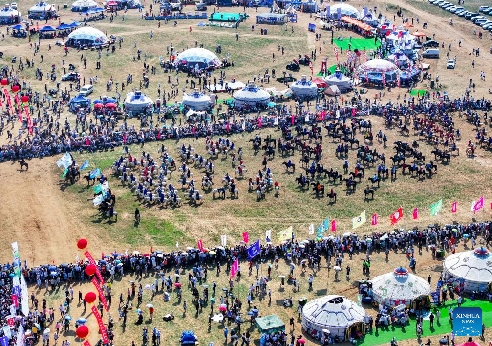 An aerial drone photo taken on July 14, 2024 shows the opening ceremony of the 34th Naadam festival in Xilin Gol League, north China's Inner Mongolia Autonomous Region. The Naadam festival kicked off here on Sunday. Naadam, usually held in mid-summer and sometimes in winter in pastoral areas of Inner Mongolia, means "games" in the Mongolian language. It often comprises wrestling, archery, and horse racing, also known as the "Three Games of Men." (Xinhua/Lian Zhen)