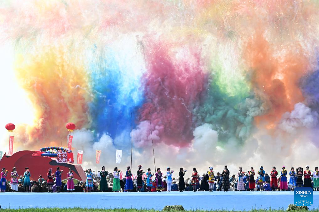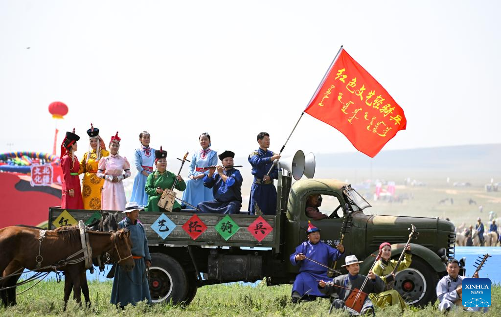 Actors perform during the opening ceremony of the 34th Naadam festival in Xilin Gol League, north China's Inner Mongolia Autonomous Region, July 14, 2024. The Naadam festival kicked off here on Sunday. Naadam, usually held in mid-summer and sometimes in winter in pastoral areas of Inner Mongolia, means "games" in the Mongolian language. It often comprises wrestling, archery, and horse racing, also known as the "Three Games of Men." (Xinhua/Bei He)