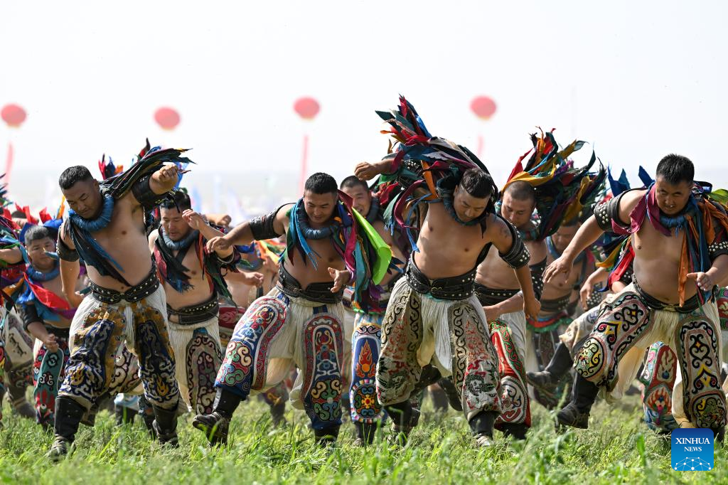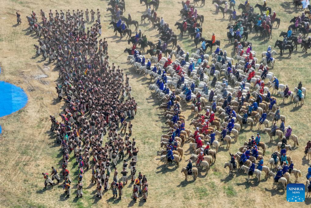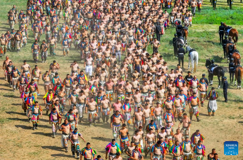 Wrestlers of traditional Mongolian style perform during the opening ceremony of the 34th Naadam festival in Xilin Gol League, north China's Inner Mongolia Autonomous Region, July 14, 2024. The Naadam festival kicked off here on Sunday. Naadam, usually held in mid-summer and sometimes in winter in pastoral areas of Inner Mongolia, means "games" in the Mongolian language. It often comprises wrestling, archery, and horse racing, also known as the "Three Games of Men." (Xinhua/Bei He)