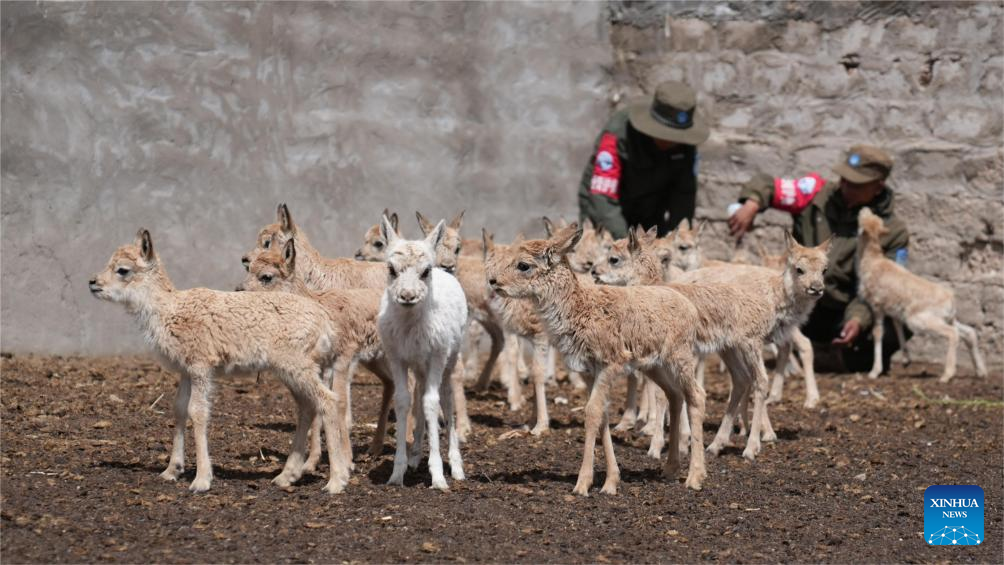 This photo taken on July 13, 2024 shows rescued Tibetan antelope cubs in Nyima County of Nagqu City, southwest China's Xizang Autonomous Region. A white Tibetan antelope cub is recently rescued by a ranger on patrol in Nyima County, which is the first white Tibetan antelope ever found by rangers in the wild of the area. Official figures show that the population of Tibetan antelopes in Xizang had grown to over 300,000 as of 2023. (Photo by Tenzing/Xinhua)