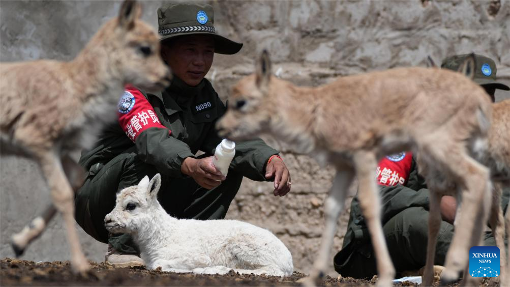A ranger feeds a Tibetan antelope cub in Nyima County of Nagqu City, southwest China's Xizang Autonomous Region, July 13, 2024. A white Tibetan antelope cub is recently rescued by a ranger on patrol in Nyima County, which is the first white Tibetan antelope ever found by rangers in the wild of the area. Official figures show that the population of Tibetan antelopes in Xizang had grown to over 300,000 as of 2023. (Photo by Tenzing/Xinhua)
