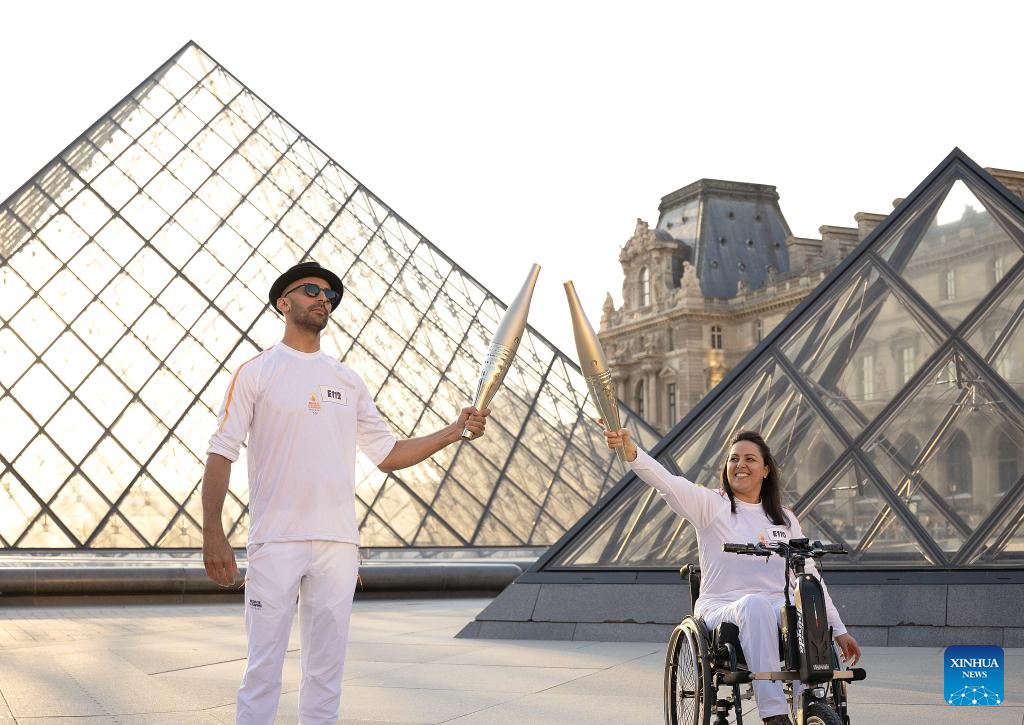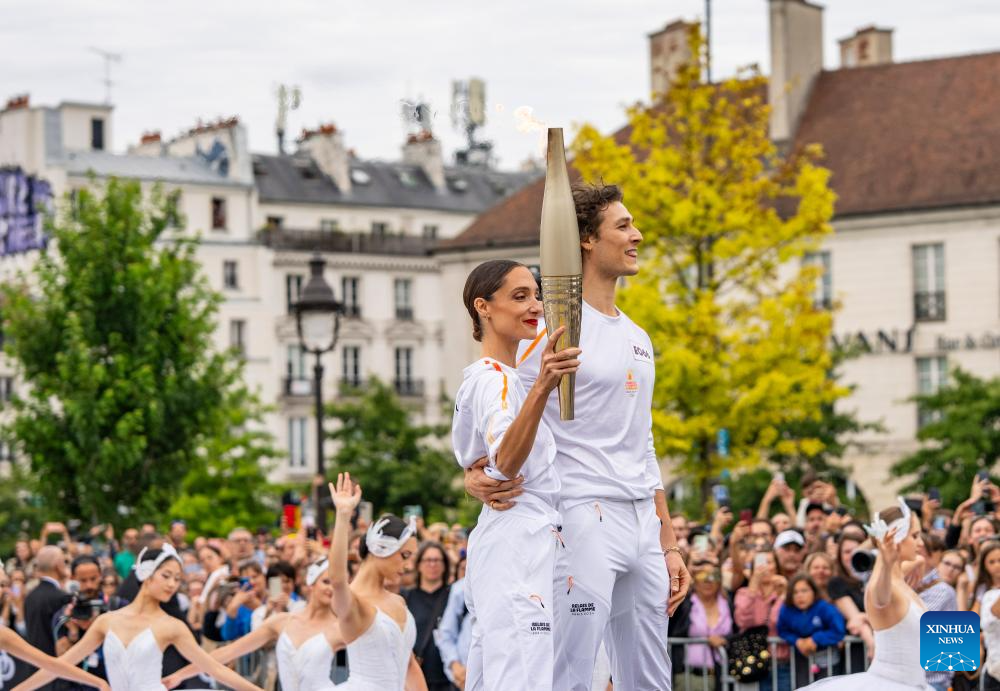 Torch bearer Hugo Marchand (R) and Dorothee Gilbert pose for photos during the Olympic Games Paris 2024 Torch Relay in Paris, France, July 14, 2024. (Xinhua/Sun Fei)