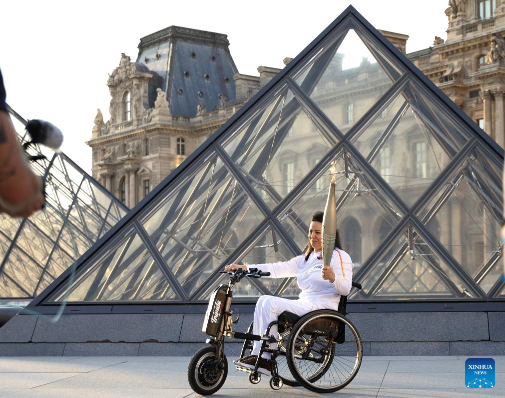 Torch bearer Sandra Laoura holds the Olympic torch during the Olympic Games Paris 2024 Torch Relay in Paris, France, July 14, 2024. (Xinhua/Cao Can)