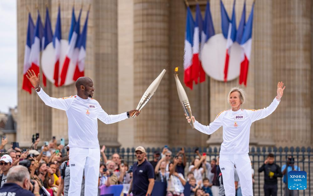 Torch bearer Jean Rene (L) passes the Olympic flame to Sandra Laoura during the Olympic Games Paris 2024 Torch Relay in Paris, France, July 14, 2024. (Xinhua/Cao Can)