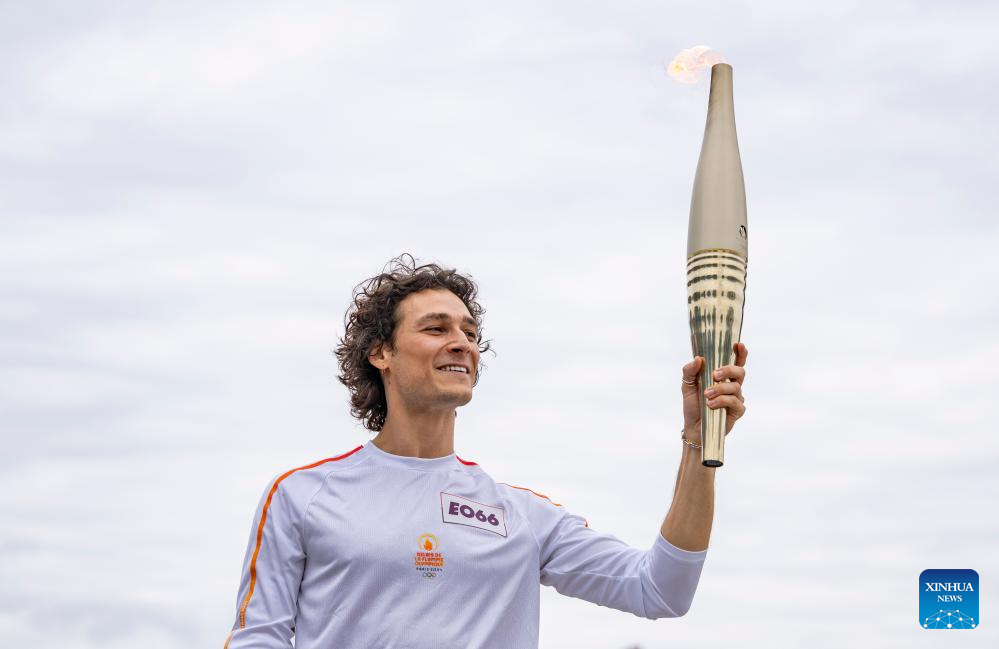 Torch bearer Hugo Marchand holds the Olympic torch during the Olympic Games Paris 2024 Torch Relay in Paris, France, July 14, 2024. (Xinhua/Sun Fei)