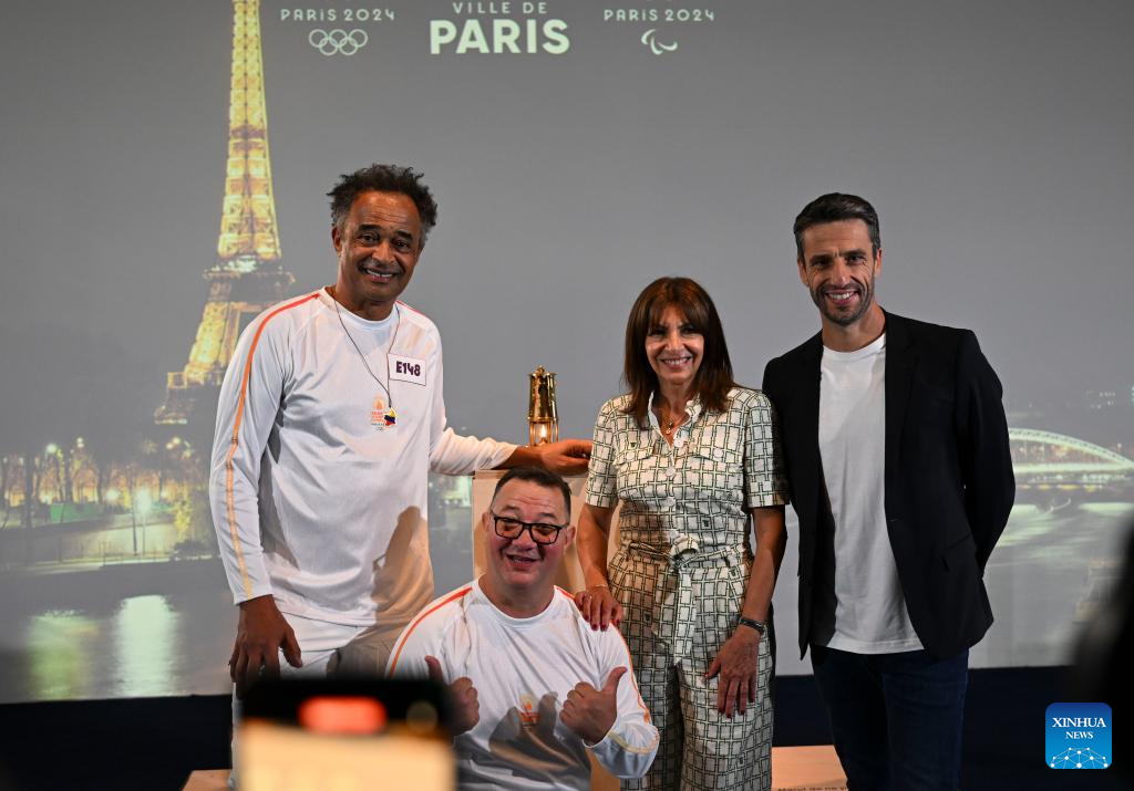 Paris 2024 Olympics and Paralympics Organizing Committee president Tony Estanguet (1st R) and Mayor of Paris Anne Hidalgo (2nd R) pose with torch bearer Yannick Noah (1st L) during the Olympic Games Paris 2024 Torch Relay in Paris, France, July 14, 2024. (Xinhua/He Changshan)
