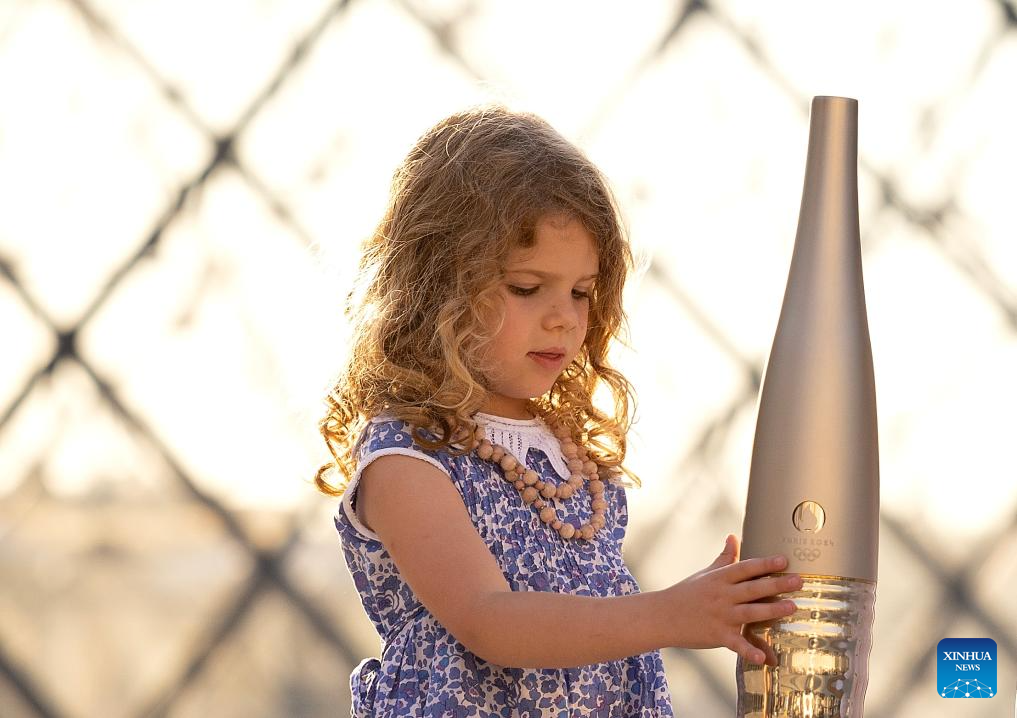 A child touches a torch during the Olympic Games Paris 2024 Torch Relay in Paris, France, July 14, 2024. (Xinhua/Cao Can)